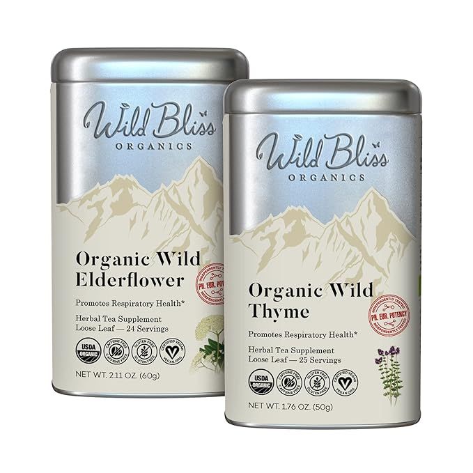 Respiratory and Bronchial Wellness Tea is a herbal remedy designed to support the health of the respiratory system. This tea is made with organic wild elderflower and thyme, both of which are known for their immune-supporting properties. It is caffeine-free and can be enjoyed throughout the day to help soothe and support the respiratory and bronchial systems.