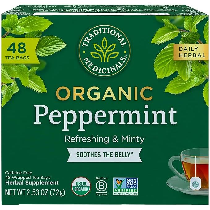 Traditional Medicinals Tea Organic Peppermint is a popular herbal remedy known for its stomach-soothing properties. This tea is made from high-quality organic peppermint leaves, which are known for their refreshing and minty flavor. Each box contains 48 tea bags, making it convenient and easy to enjoy the soothing benefits of peppermint whenever you need it.