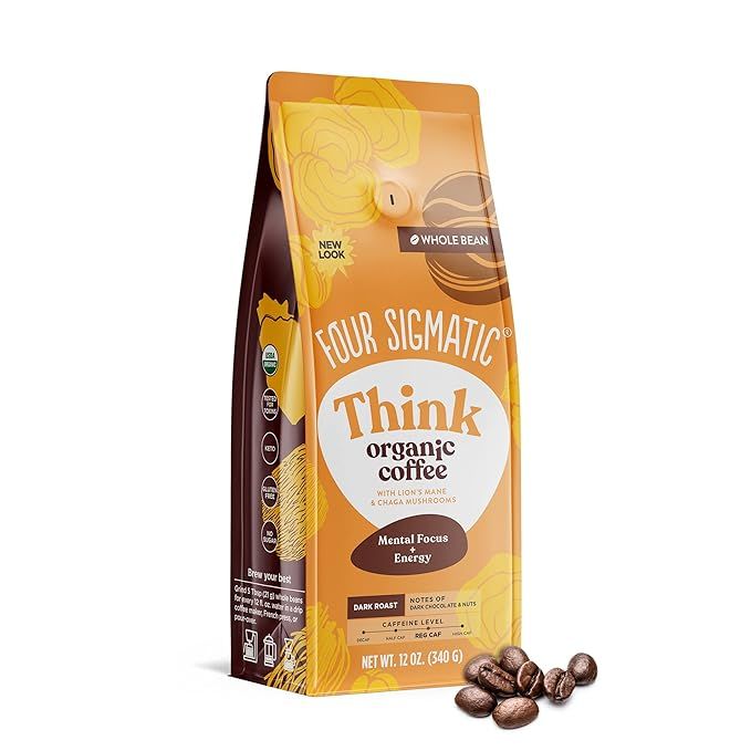 Dark Roast Organic Whole Bean Coffee by Four Sigmatic | Fair Trade Coffee Beans Coated with Lion's Mane, Chaga Mushrooms | Nootropic Mushroom Coffee for Enhanced Brain Function & Immune Support | 12oz