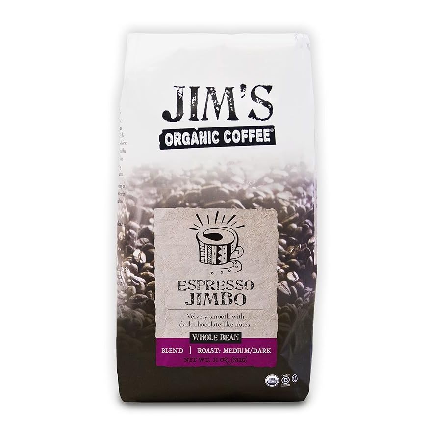 Jim’s Organic Coffee – Espresso Jimbo Blend – Medium/Dark Roast, Whole Bean, 11 oz Bag