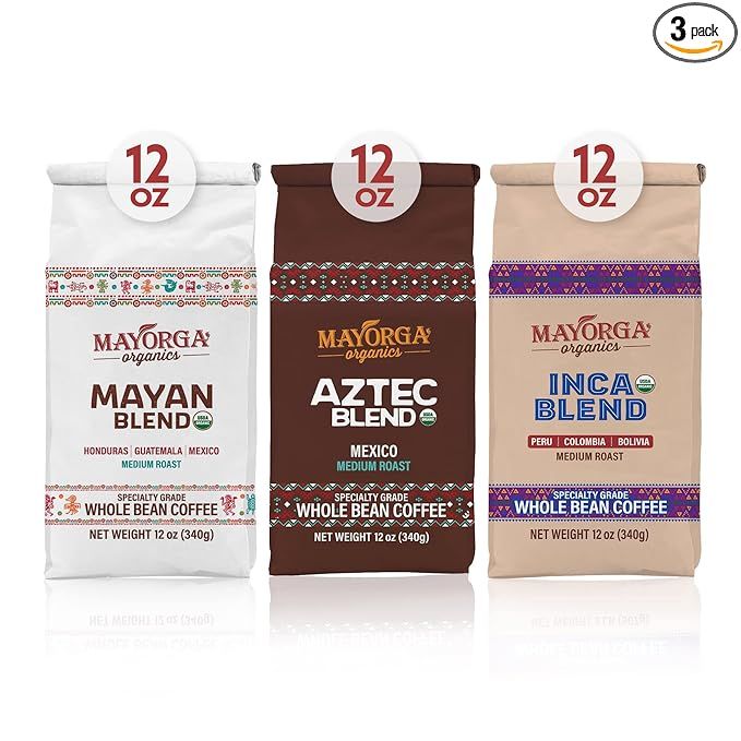 Mayorga Coffee Gift Pack of 3, 12 oz bags - Medium Roast Sampler Pack - Mayan Blend, Aztec Blend, & Inca Blend - 100% Arabica Whole Bean Organic Coffee - Specialty Grade, Non-GMO, Direct Trade