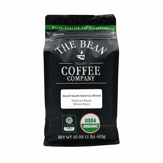 The Bean Organic Coffee Company Water Processed DECAF South America Blend, Medium Roast, Whole Bean Coffee, 16-Ounce Bag