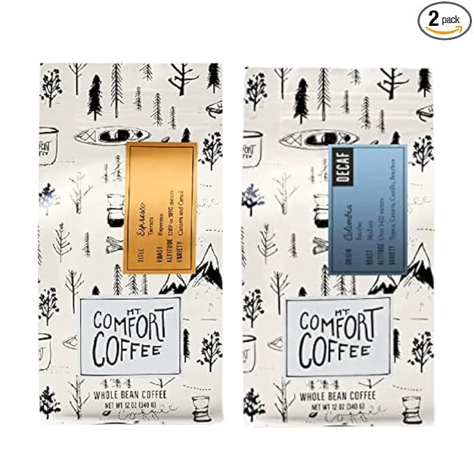 Mt. Comfort Coffee Espresso Roast & Decaf Medium Roast, 12 oz Bag, (Pack of 2) - Flavor Notes of Chocolate & Caramel - Roasted Whole Beans