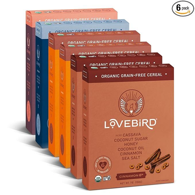 Lovebird Gluten & Grain Free Cereal Variety 6 Pack - Organic AIP Food, Paleo Dairy Free, No Refined Sugar Breakfast Cereals | Healthy Snacks for Kids, Adults - Cacao, Honey, Cinnamon, Unsweetened