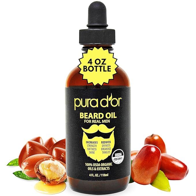 PURA D'OR 4 Oz ORGANIC Beard Oil is a USDA certified and 100% natural leave-in conditioner designed for beard care and maintenance. Made with a blend of organic argan and jojoba oils, this beard oil helps to increase softness and strength of beard hair while nourishing the skin underneath.