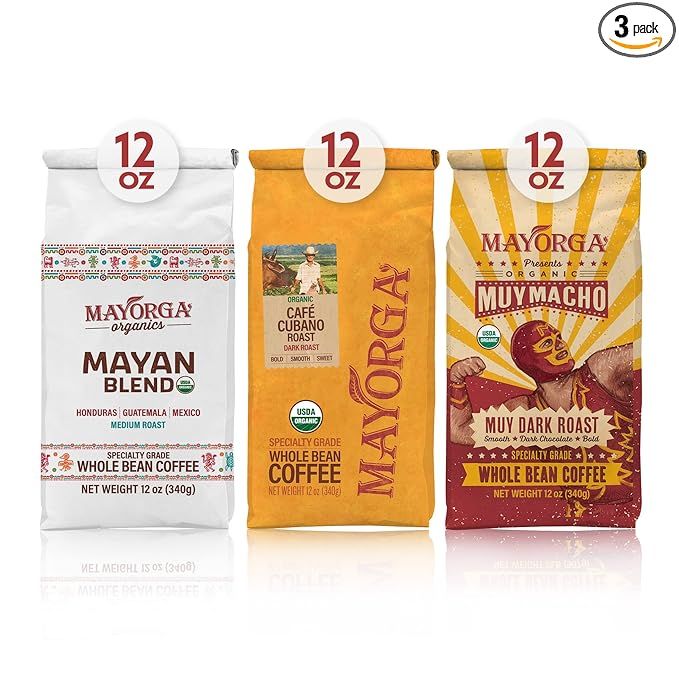 Mayorga Dark Roast Coffee Gift Pack of 3, 12 oz bags- Cubano Roast Coffee Roast - 100% Arabica Café Whole Coffee Beans - Smoothest Organic Coffee - Specialty Grade, Non-GMO, Direct Trade