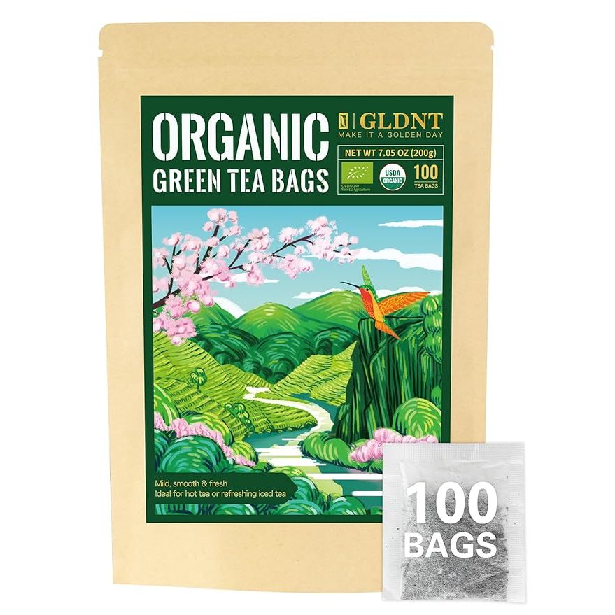 GLDNT Organic Green Tea Bags, Natural Pure Organic Green Tea, Super Antioxidant, Caffeinated, 100 Count