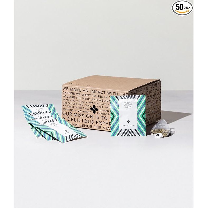 The Art of Tea Organic Pacific Coast Mint is a naturally caffeine-free peppermint tea that comes in a box of 50 eco-friendly pyramid tea bags. Each tea bag is individually wrapped in a sachet for freshness and convenience.