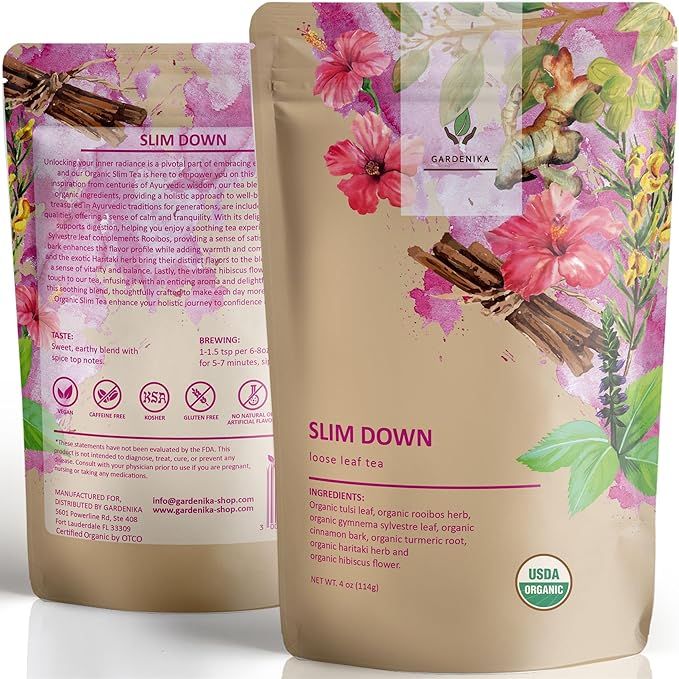 Gardenika Organic Slim Loose Leaf Tea, Herbal, Caffeine-Free, KSA Kosher, Ayurvedic Blend with Tulsi, Rooibos, Turmeric, Hibiscus – 4 oz (1 Pack)