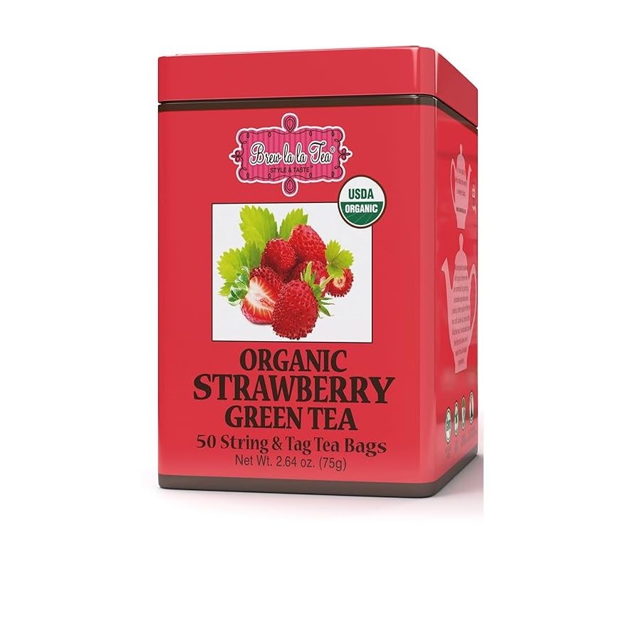 Brew La La Organic Green Tea - Natural Strawberry Flavor - 50 Tea Bag Tin - Low Caffeine Gourmet Tea - USDA Certified Organic
