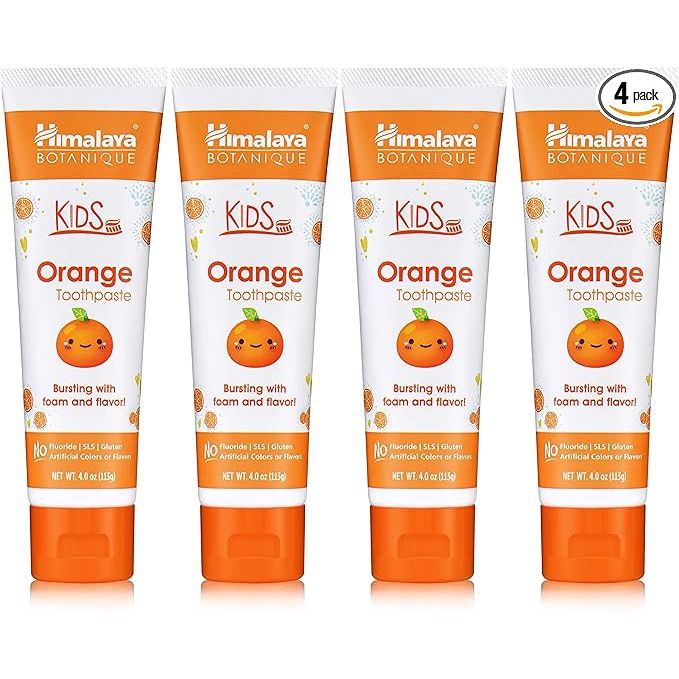 Himalaya Botanique Kids Toothpaste, Herbal, Orange Flavor, Fights Plaque, Fluoride Free, Gentle, No Artificial Flavors or Colors, SLS Free, Gluten Free, Cruelty Free, Vegan, Foaming, 4 Oz, 4 Pack