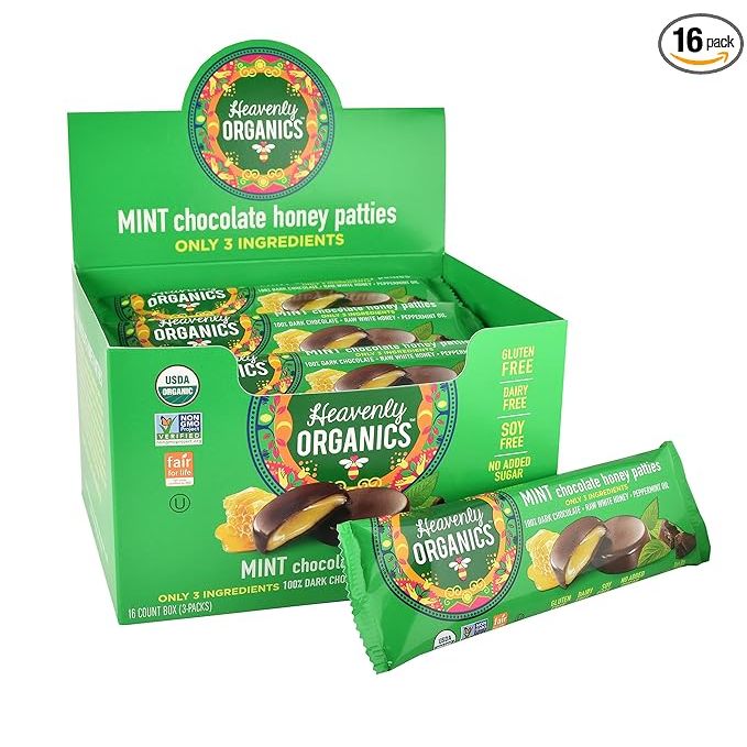 Heavenly Organics Mint Chocolate Honey Patties, (16 Per Box) Made with 100% Organic Cocoa and 100% Organic Raw White Honey; Non-GMO, Fair Trade, Kosher, Dairy & Gluten Free, No Sugar Added