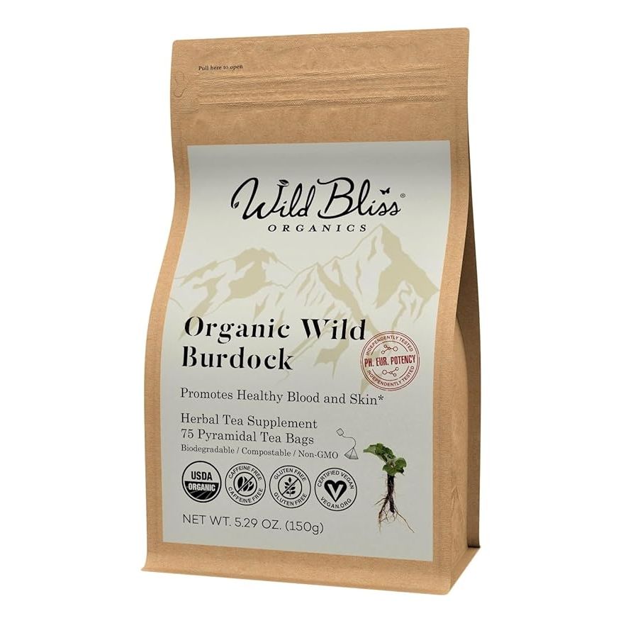 Organic Wild Burdock Root Tea - Caffeine Free Herbal Detox Support - Pharmacopoeia Quality - 75 Plant Based Tea Bags