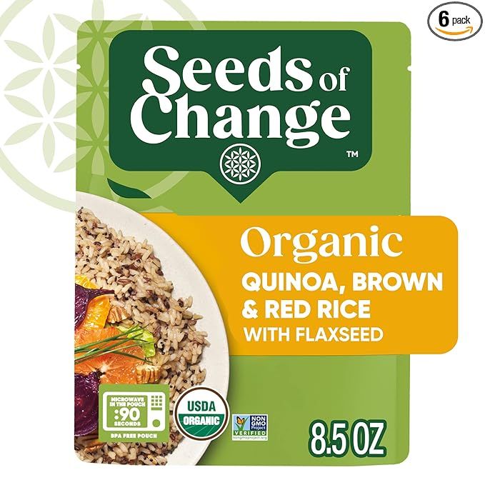 SEEDS OF CHANGE Organic Quinoa, Brown & Red Rice with Flaxseed is a convenient and nutritious option for those looking for a quick and easy meal. Each pack contains 8.5 ounces of pre-cooked quinoa, brown and red rice, and flaxseed that is microwaveable and ready to heat in just 90 seconds. This pack of 6 is perfect for stocking up your pantry with a healthy and delicious option for busy days.
