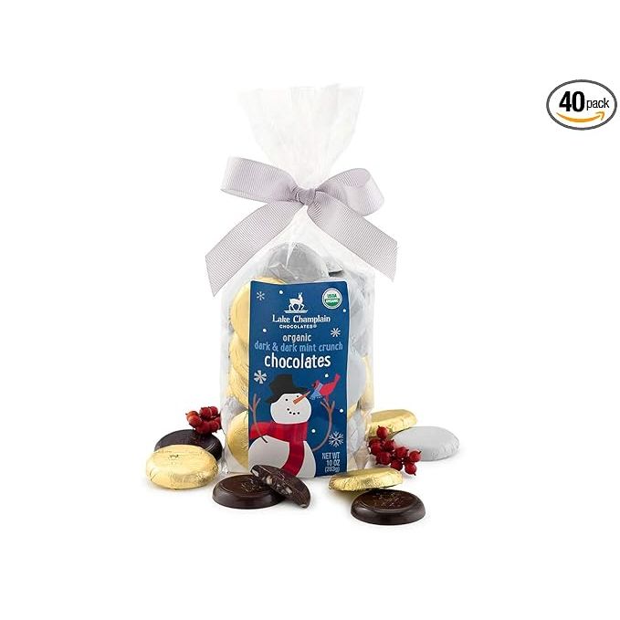 Whether you're craving a sweet treat for yourself or looking for a thoughtful gift for someone special, the Lake Champlain Assorted Organic Winter Dark Chocolate & Peppermint Coins Gift Bag is a delicious and festive option that is sure to please chocolate enthusiasts of all ages. Description by ChatGPT.