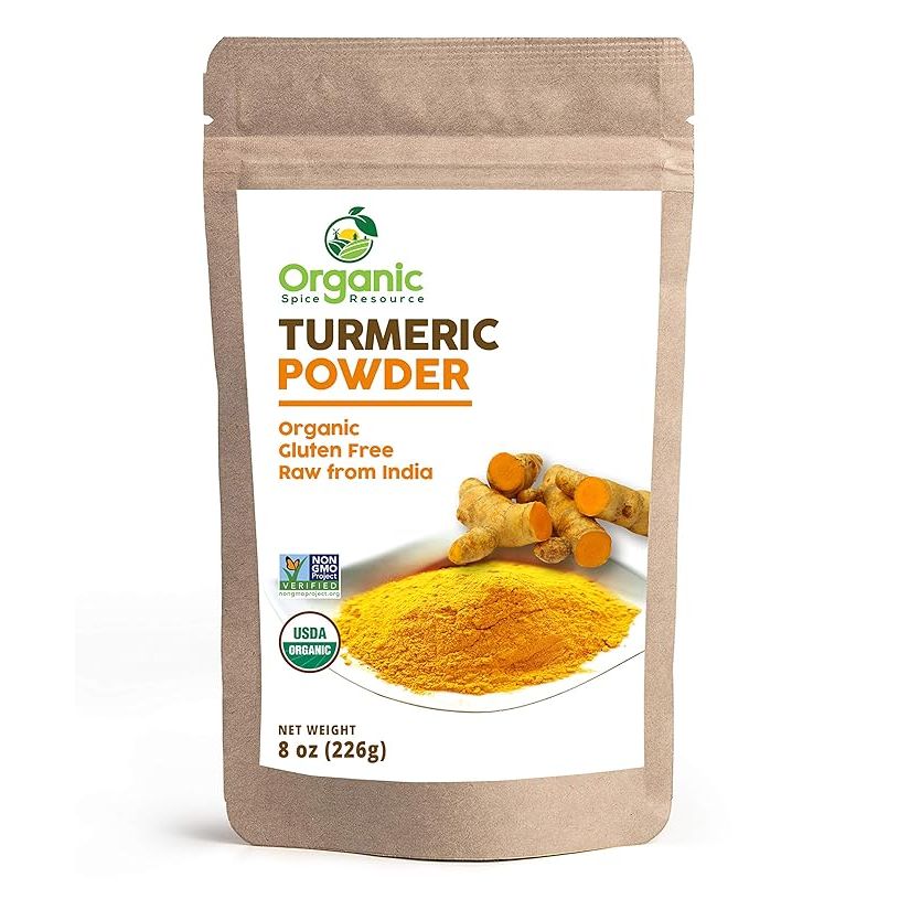 Organic Turmeric Powder with Curcumin by OSR is a high-quality product made from pure turmeric sourced from organic farms. It comes in an 8-ounce (226g) packaging, which is USDA Organic and Non-GMO certified, ensuring that the product is free from synthetic chemicals or genetically modified organisms.