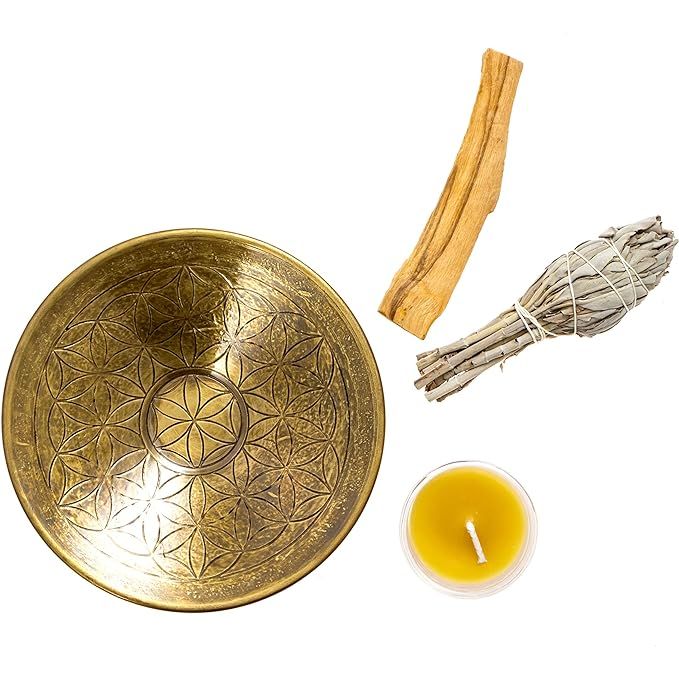 Flower of Life Smudge Kit - Brass Dish Incense Holder with White Sage, Palo Santo, Beeswax Candle Votive - for Spiritual Cleansing, Meditation Accessories, Altar Supplies, Spiritual Gifts