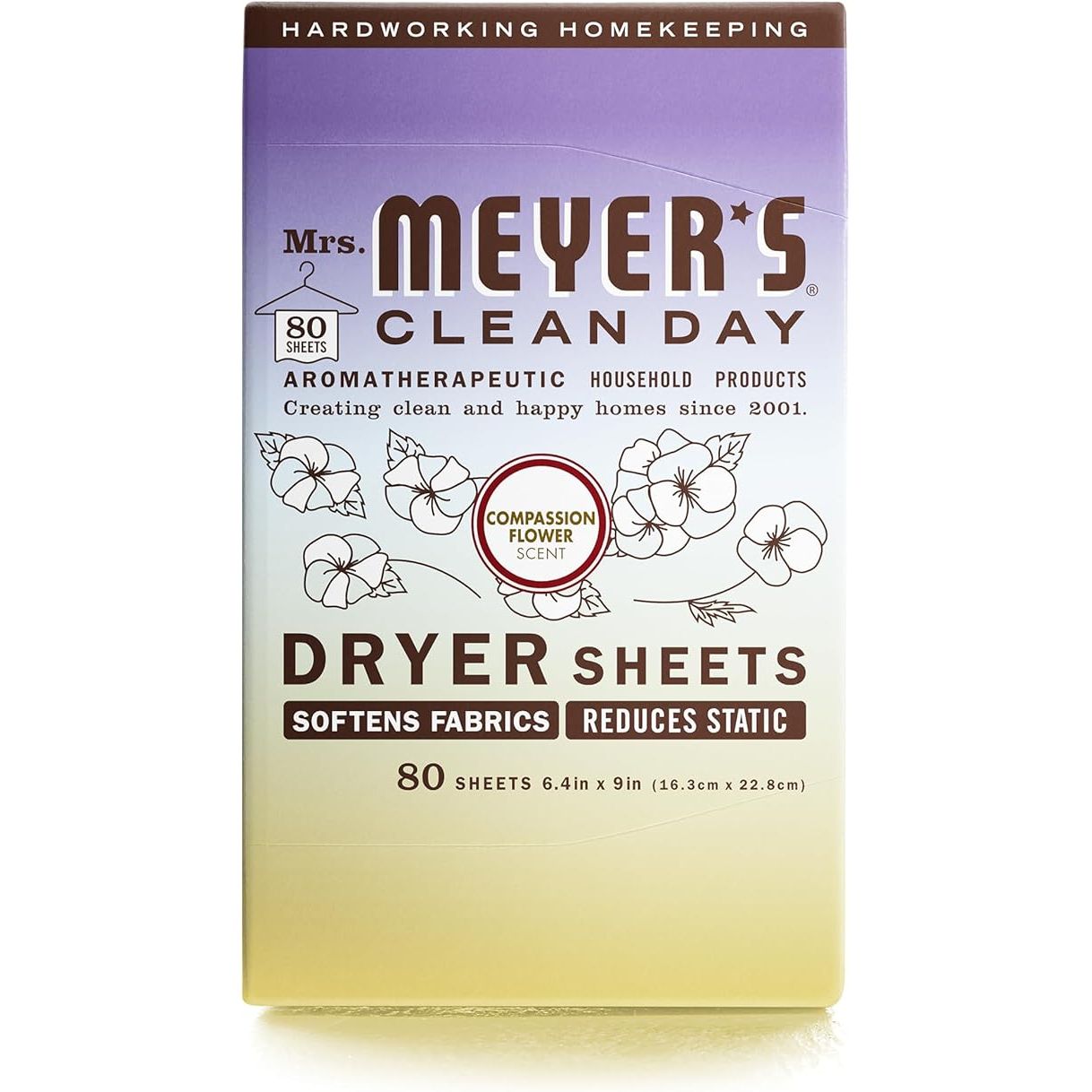 MRS. MEYER'S CLEAN DAY Dryer Sheets, Fabric Softener, Reduces Static, Infused with Essential Oils, Compassion Flower, 80 Count