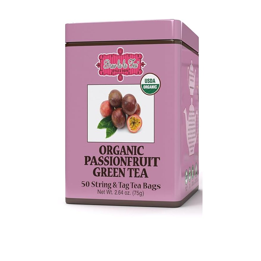 Brew La La Organic Green Tea - Passionfruit Flavor - 50 Tea Bag Tin - Low Caffeine Tea - USDA Certified Organic
