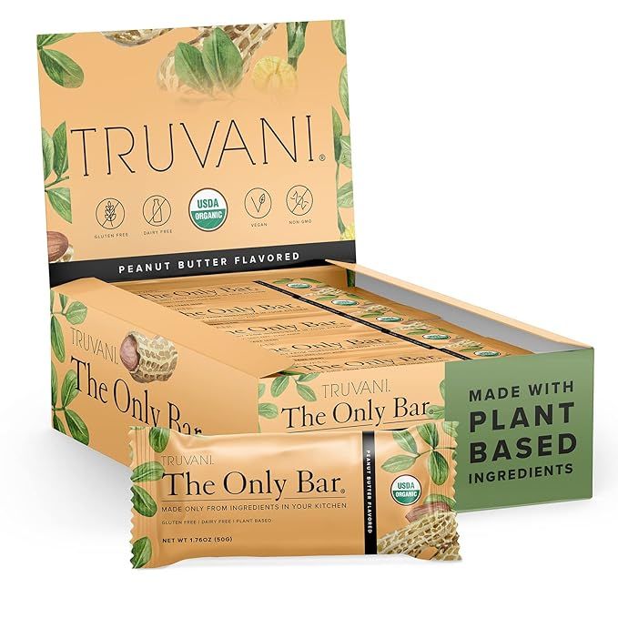 Truvani Plant Based Snack Bars | 8g Protein | 12 Pack Peanut Butter | Organic | Vegan | The Only Bar | Dairy, Soy, and Gluten Free | Individually Wrapped