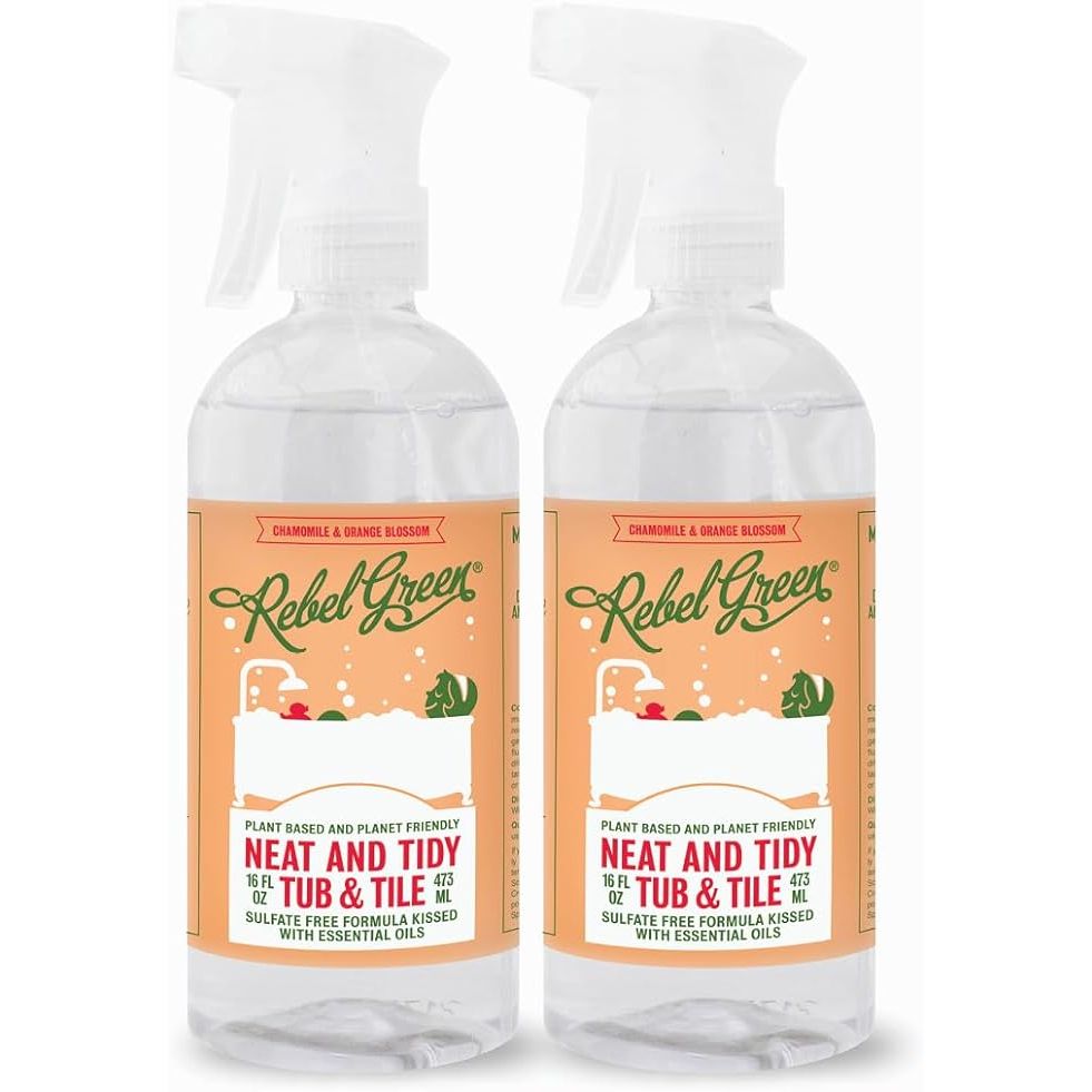 Rebel Green Neat and Tidy Tub & Tile Cleaner - Chamomile and Orange Blossom Scent Bathroom Cleaner Spray - all Natural Cleaning Products, Non-Toxic Bathroom Tub Cleaner & Shower Cleaner Spray, 2x16 oz