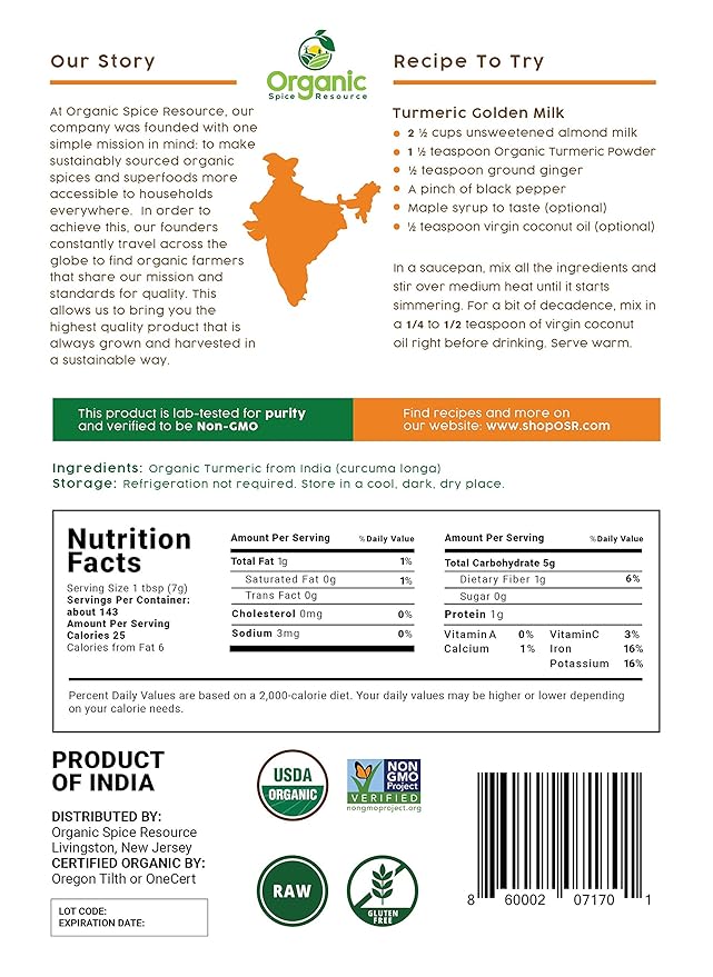Organic Turmeric Powder with Curcumin by OSR is a premium quality product that comes in a large 35.27-ounce (2.2-pound) container. It is certified USDA Organic and Non-GMO, ensuring that it meets strict standards for purity and quality. The turmeric powder is lab-tested for heavy metals and purity, guaranteeing that it is safe for consumption.