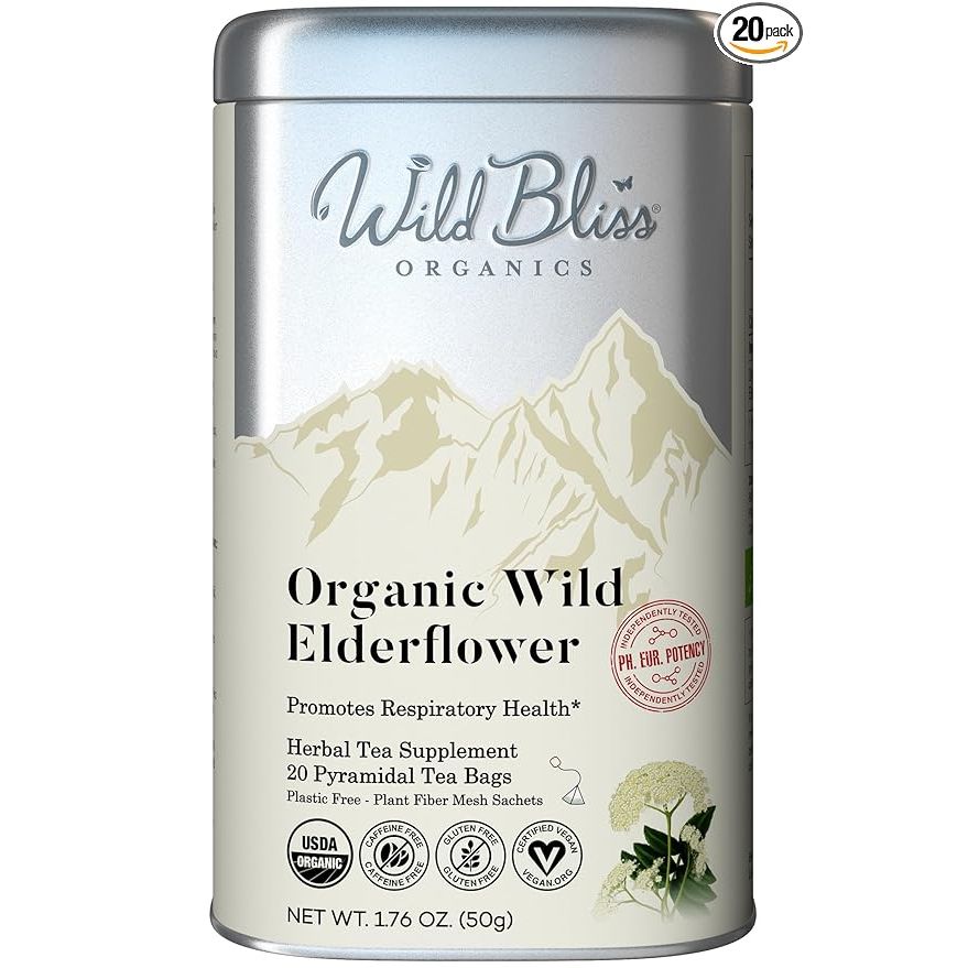 Wild Bliss Organic Elderflower Herbal Tea - Caffeine Free Elder Flowers Tisane - Pharmacopoeia Potency - 20 Plant Based Tea Bags