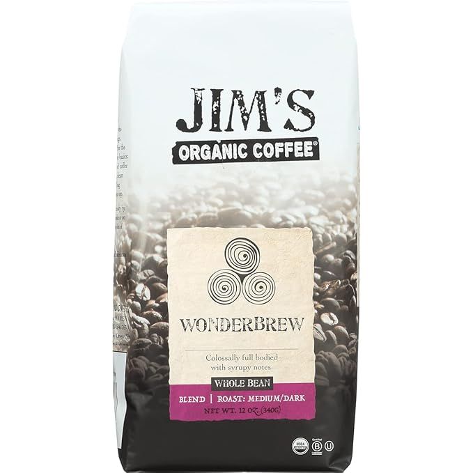 Jim’s Organic Coffee – Wonderbrew Blend – Medium/Dark Roast, Whole Bean, 12 oz Bag - Certified Organic, Regeneratively Grown, Ethically Traded, Shade Grown Coffee