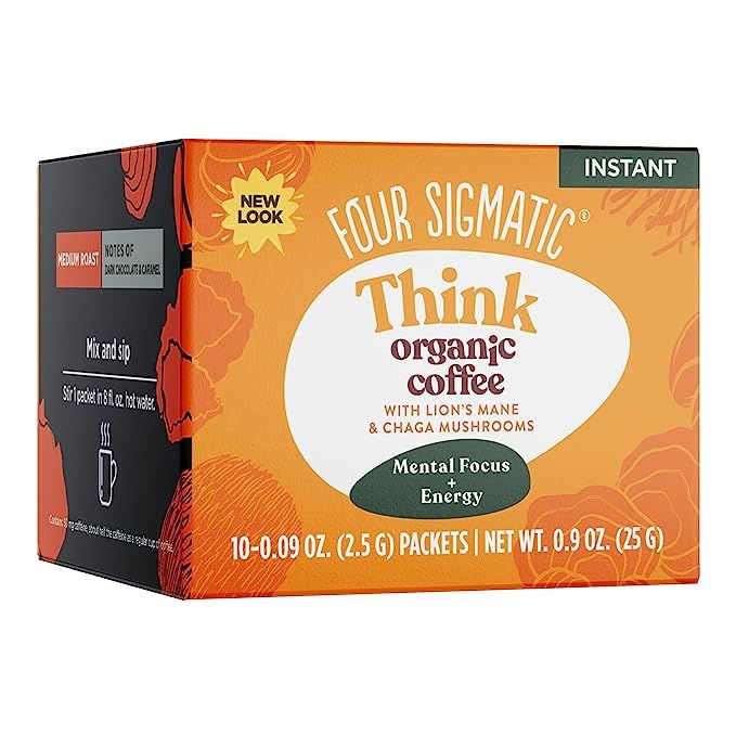 Four Sigmatic Think Organic Mushroom Coffee is a unique blend of Arabica instant coffee singles infused with Lion's Mane, Chaga, and Rhodiola mushrooms. Each box contains 10 packets, making it convenient for on-the-go use. This mushroom coffee instant mix is designed to enhance focus and provide immune support, making it a great option for those looking for a natural way to boost productivity and well-being.