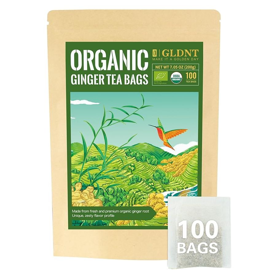 GLDNT Organic Ginger Tea Bags, Natural Organic Ginger Root Tea, Spicy & Zesty Flavor, Caffeine Free, 100 Count