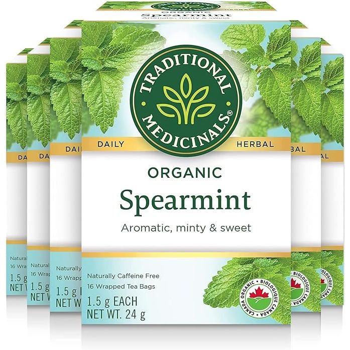 Traditional Medicinals Organic Spearmint Herbal Tea Bags come in a pack of 6, with each box containing 16 tea bags. This refreshing tea is made from certified organic spearmint leaves, grown without the use of harmful chemicals or pesticides. The tea is caffeine-free, making it a great choice for any time of day.