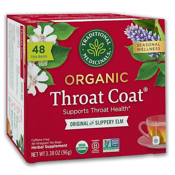 Traditional Medicinals Organic Throat Coat Tea is a popular herbal tea blend specifically formulated to support throat health. Each box contains 48 tea bags, allowing for a convenient and easy way to incorporate the tea into your daily routine.