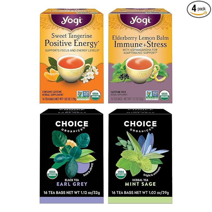 Yogi Tea & Choice Organics Tea Variety Pack - 16 Tea Bags per Pack (4 Packs) - Organic Tea Sampler Gift Box - Includes Yogi Sweet Tangerine Positive Energy Tea, Choice Organics Earl Grey & More