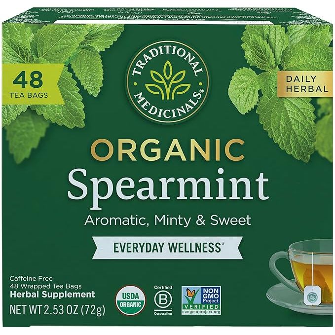 Traditional Medicinals Organic Spearmint Tea is a popular herbal tea known for its refreshing and subtly sweet taste. Made from certified organic spearmint leaves, this tea is caffeine-free and can be enjoyed at any time of day. Spearmint is known for its soothing properties and has been traditionally used to support digestion and overall wellness.