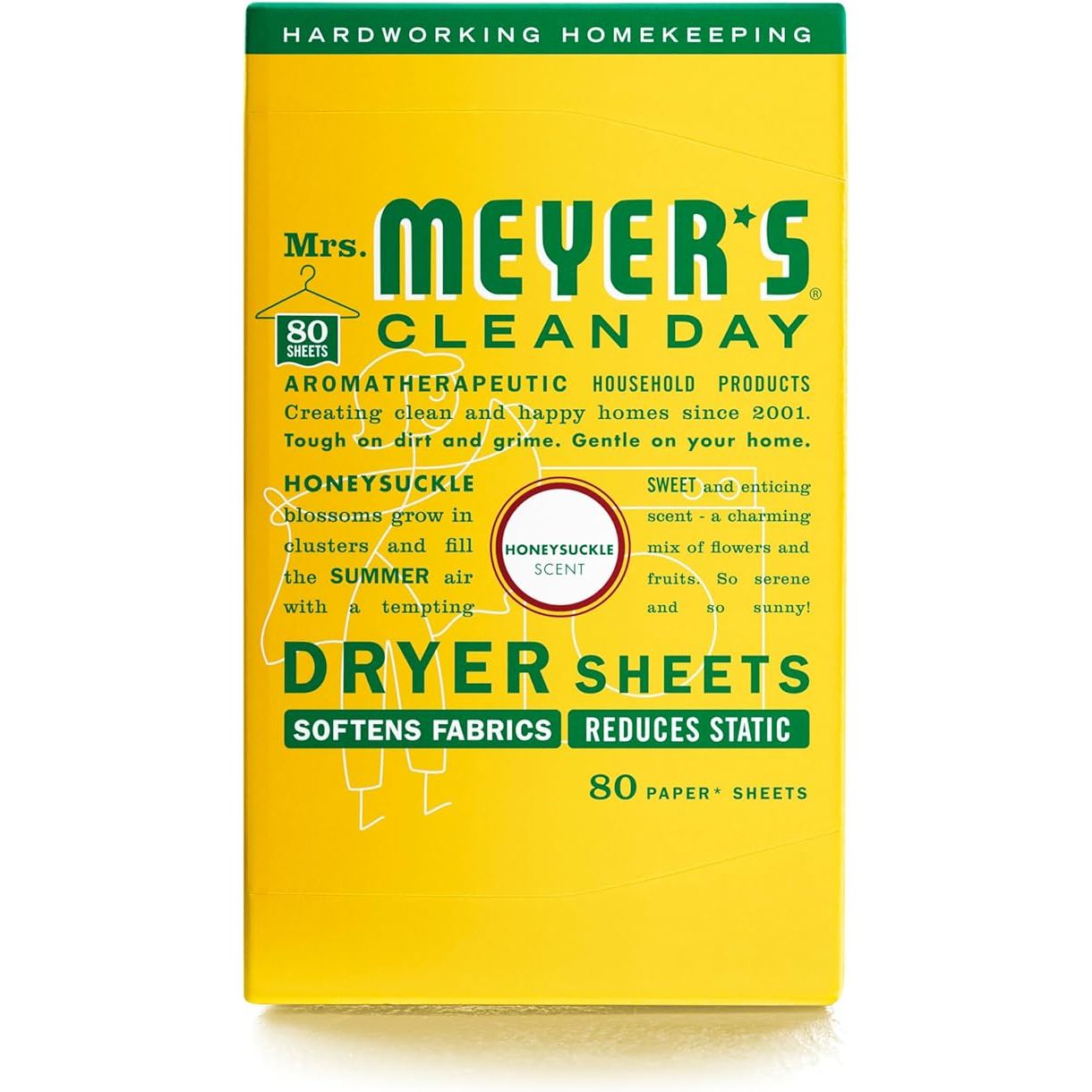 MRS. MEYER'S CLEAN DAY Dryer Sheets are an eco-friendly and effective way to naturally soften fabrics and reduce static cling in the dryer. Each box contains 80 sheets infused with a delightful honeysuckle scent that leaves your laundry smelling fresh and clean. Made with biodegradable ingredients and essential oils, these dryer sheets are free from harsh chemicals and artificial fragrances.