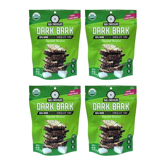 Taza Chocolate Organic Stone Ground 80% Dark Bark Snacking Thins, Toasted Coconut, come in a pack of 4 with each pack weighing 4.2 ounces. These thin pieces of dark chocolate are made with organic ingredients and stone ground for a unique texture and flavor. The addition of toasted coconut provides a delicious crunch and tropical flavor to the rich, dark chocolate.
