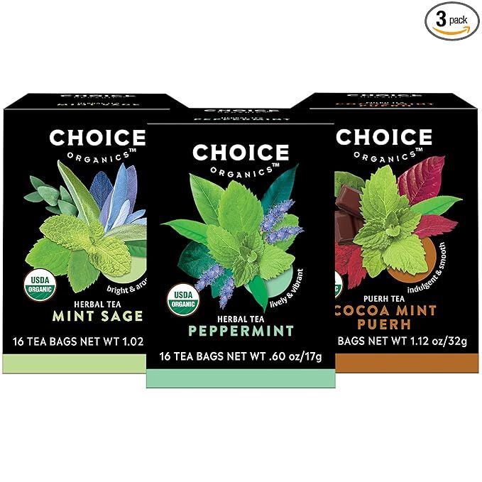 Choice Organics Mint Tea Variety Pack Sampler includes three different mint tea blends: Peppermint, Mint Sage, and Cocoa Mint Puerh. Each pack contains 48 tea bags, making it a great option for those who enjoy a variety of mint flavors.