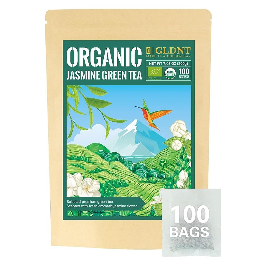 GLDNT Organic Jasmine Green Tea Bags, Organic Green Tea Scented with Jasmine Flowers, Floral Aroma & Smooth Taste, 100 Count