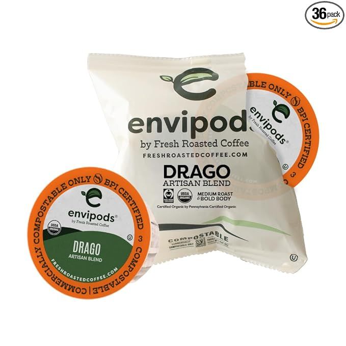 Fresh Roasted Coffee,Organic Drago Fair Trade Compostable Envipods, Medium Roast, Kosher | 36 Count Individually Wrapped for Keurig K Cup Brewers | Not for use in Ninja or Hamilton Beach Brewers