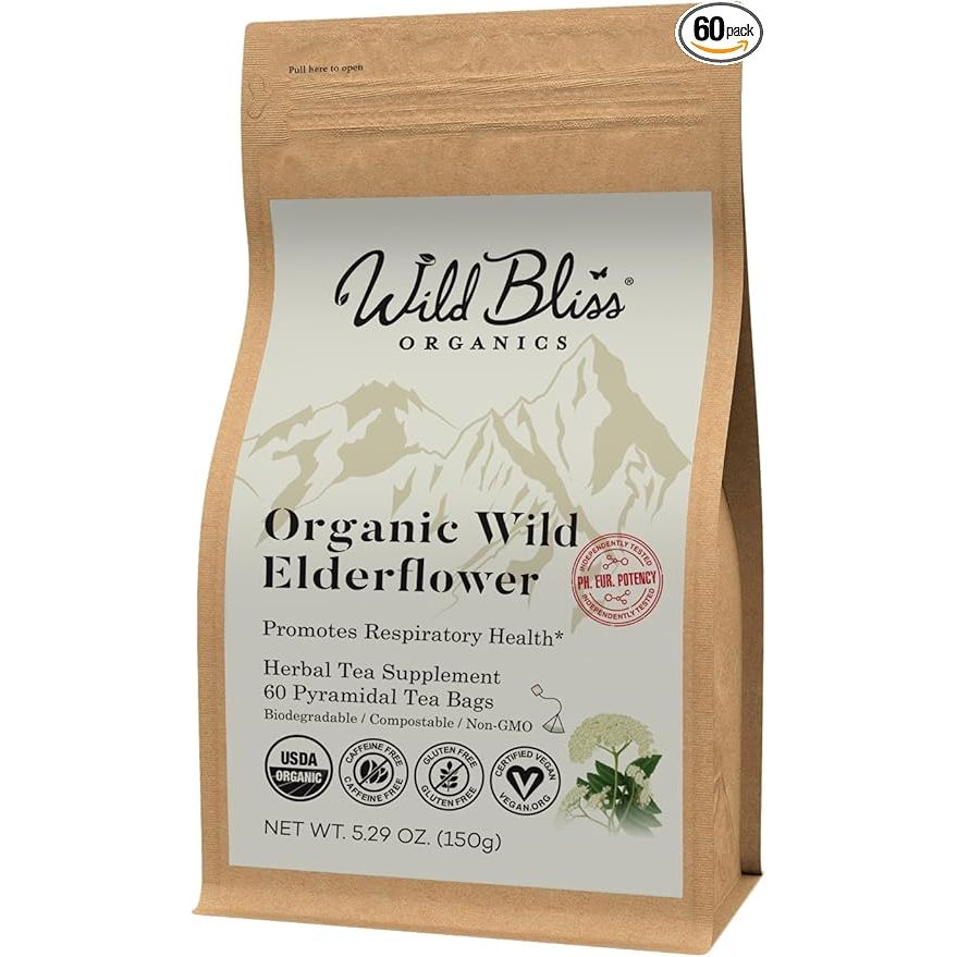 Organic Elderflower Herbal Tea - Caffeine Free Elder Flowers Tisane - Pharmacopoeia Potency - 60 Plant Based Tea Bags